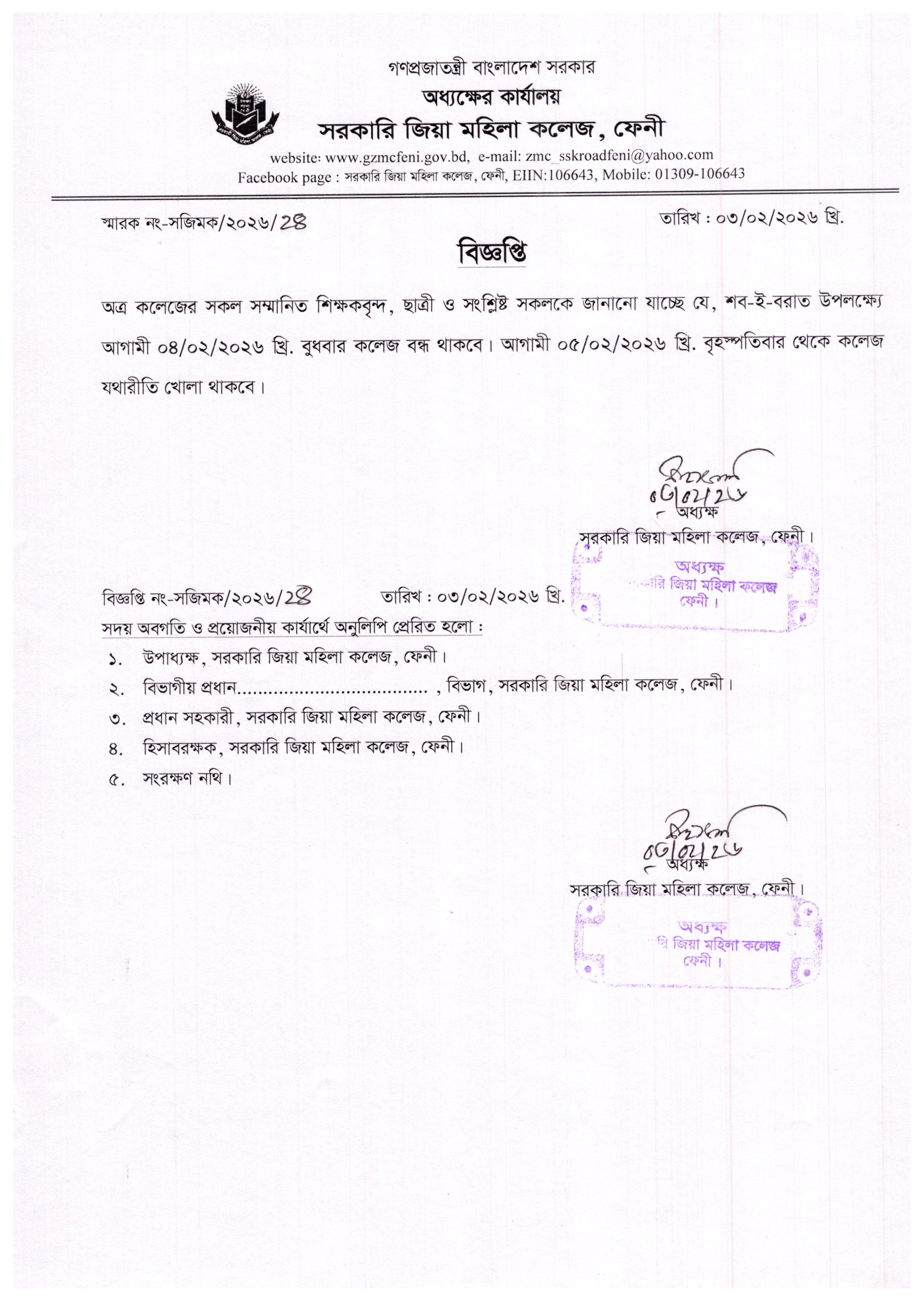 ত্রয়োদশ জাতীয় সংসদ নির্বাচনী-২০২৬ ও শ্রী শ্রী শিবরাত্রি ব্রত উপলক্ষ্যে কলেজ ও শ্রেণিকার্যক্রম বন্ধের বিজ্ঞপ্তি। |