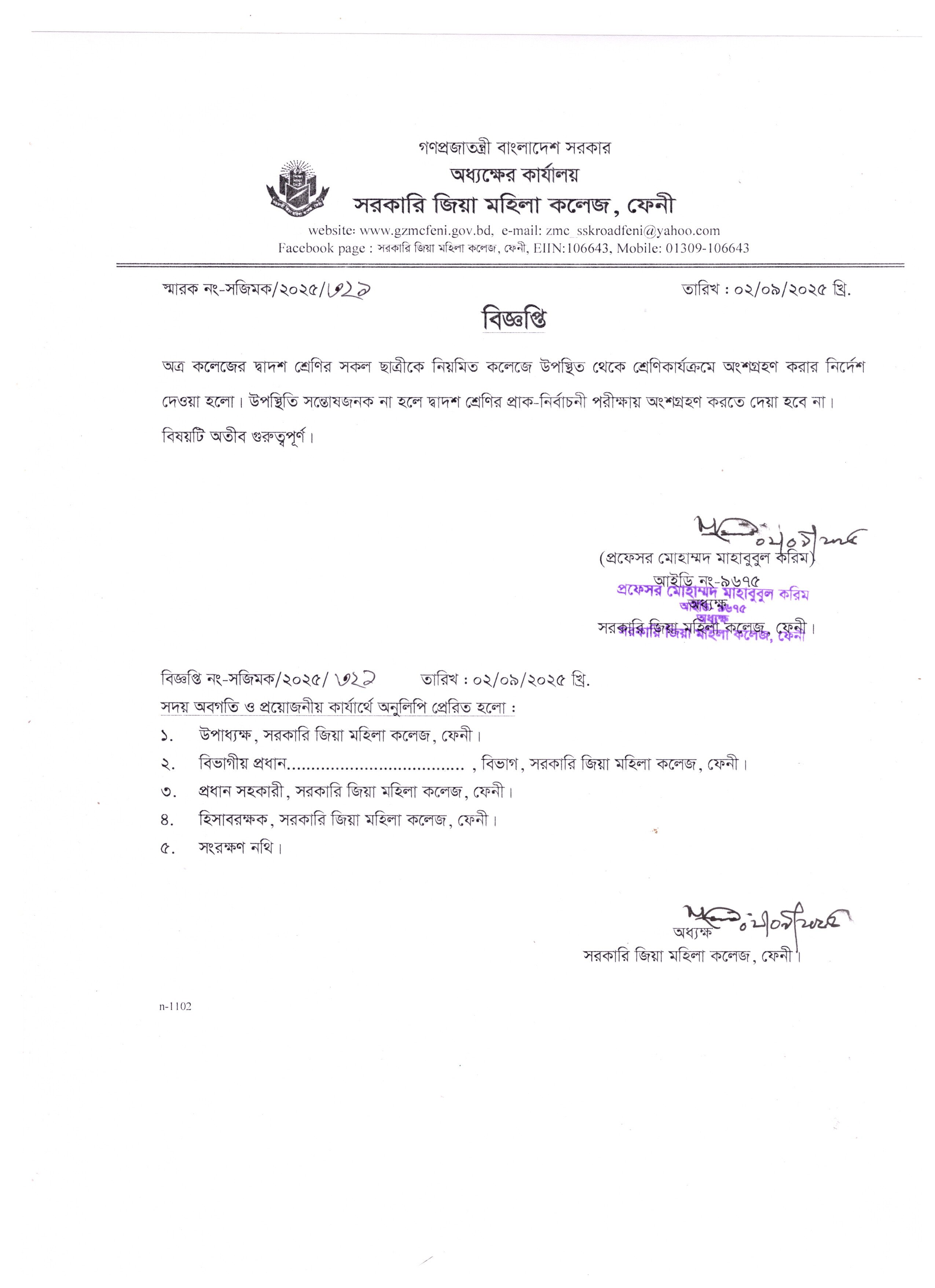 দ্বাদশ শ্রেণির ছাত্রীদের নিয়মিত শ্রেণিকার্যক্রমে উপস্থিত থাকার বিজ্ঞপ্তি। Download