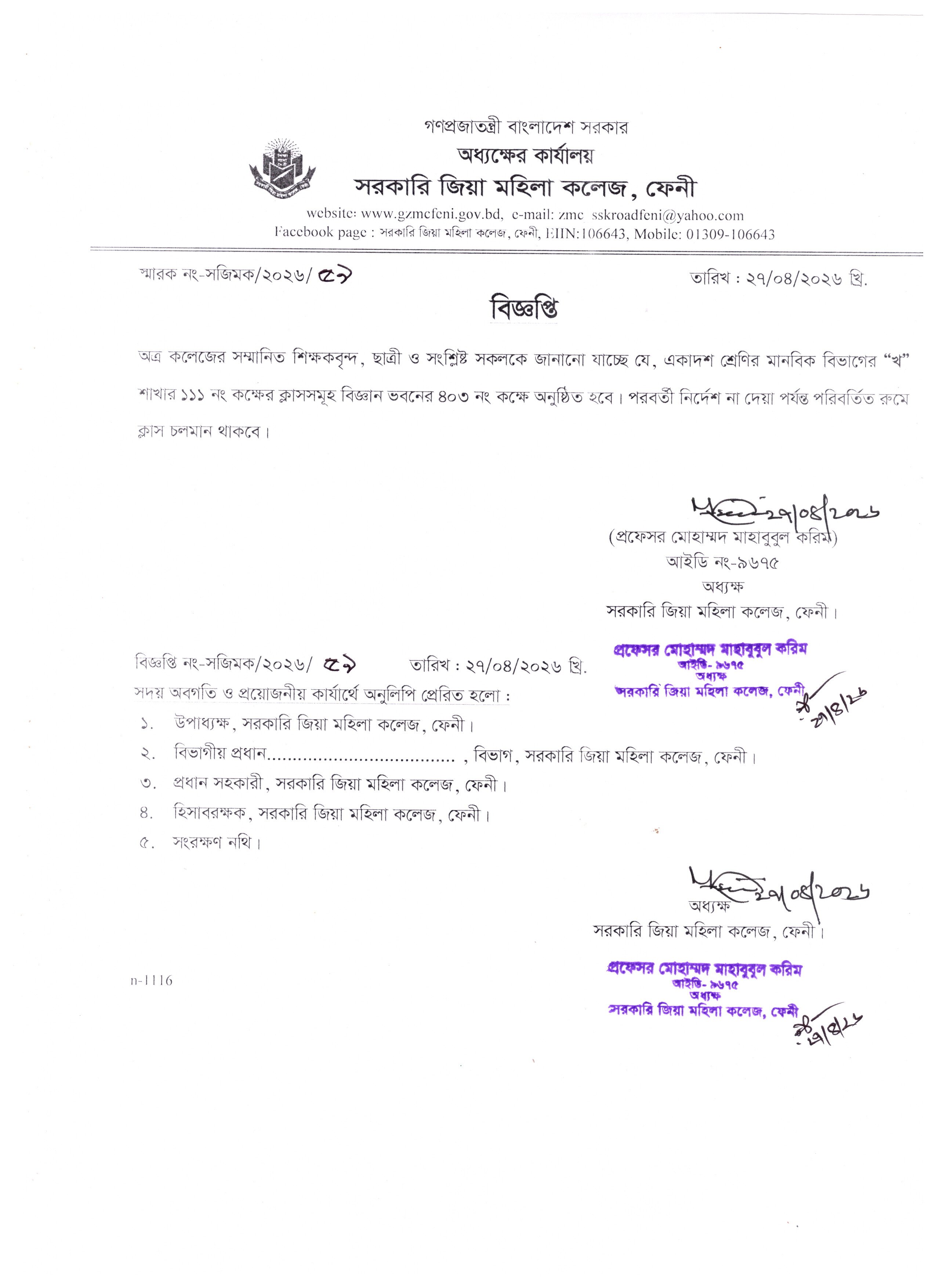 - একাদশ শ্রেণির মানবিক বিভাগের খ শাখার ১১১ নং কক্ষের ক্লাস পরিবর্তন প্রসঙ্গে।