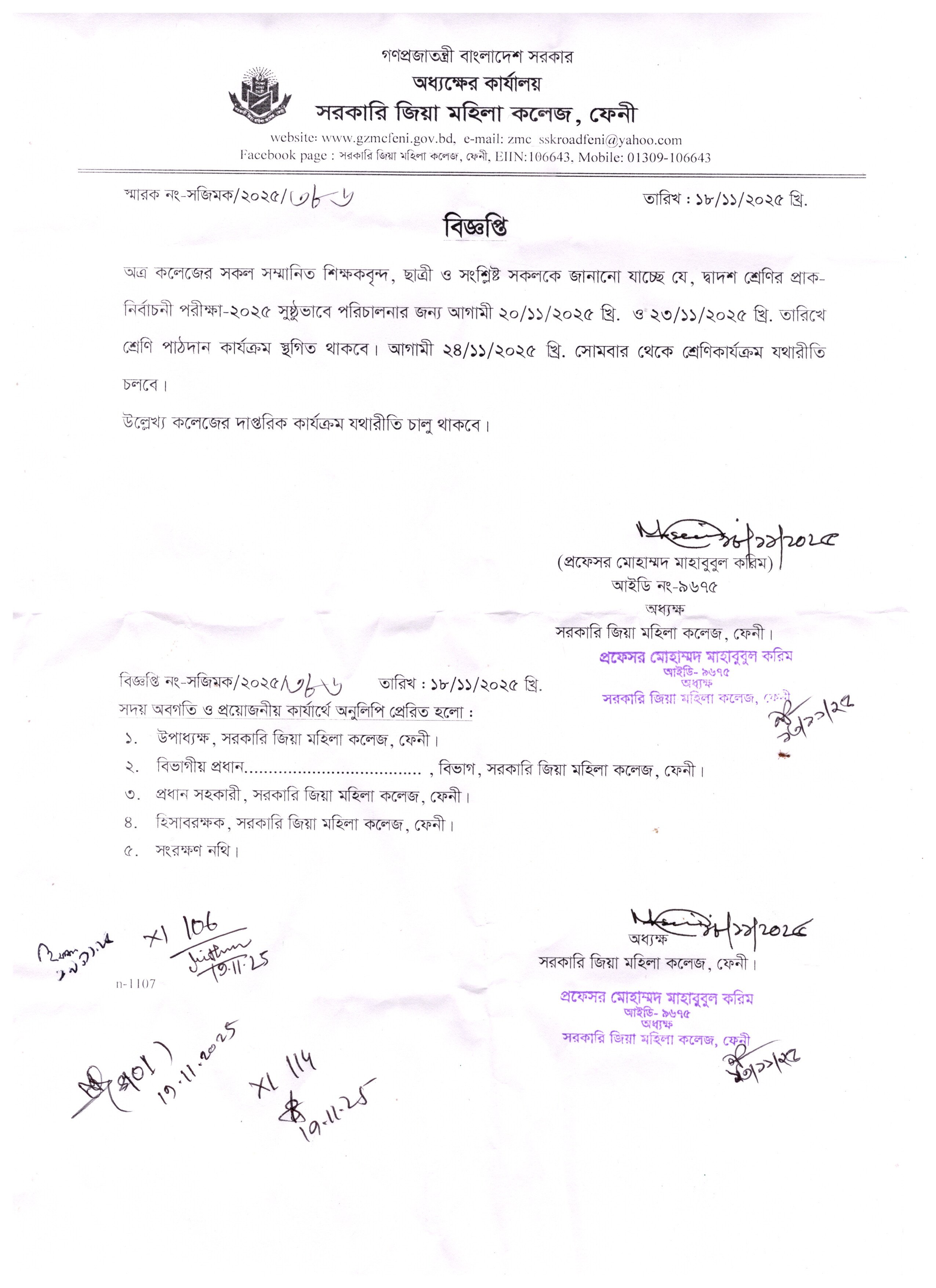 - দ্বাদশ শ্রেণির প্রাক-নির্বাচনী পরীক্ষা-২০২৫ সুষ্ঠুভাবে পরিচালনার জন্য আগামী ২০ ও ২৩ নভেম্বর ২০২৫ খ্রি. শ্রেণি পাঠদান কার্যক্রম স্থগিতের বিজ্ঞপ্তি।