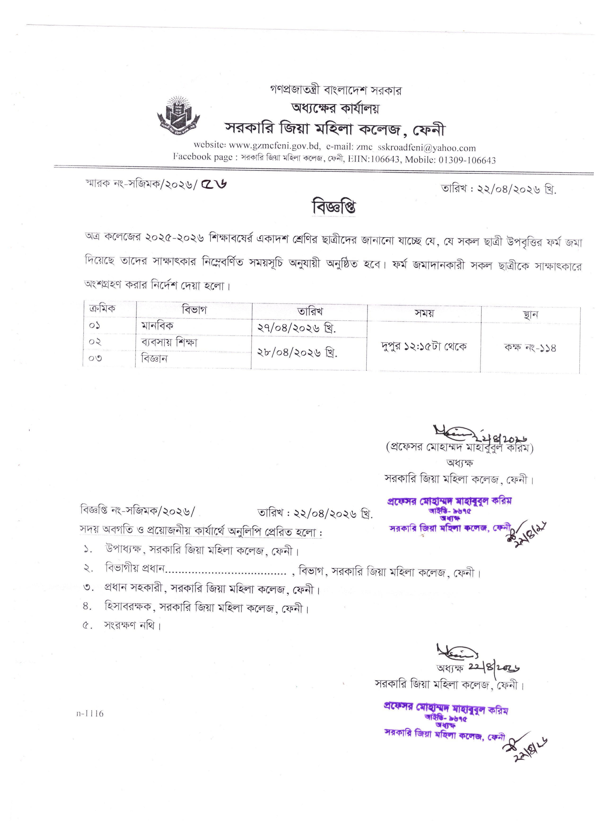 - ২০২৫-২০২৬ শিক্ষাবর্ষে একাদশ শ্রেণির উপবৃত্তি ফর্ম জমাদানকারী ছাত্রীদের সাক্ষাৎকারের বিজ্ঞপ্তি।