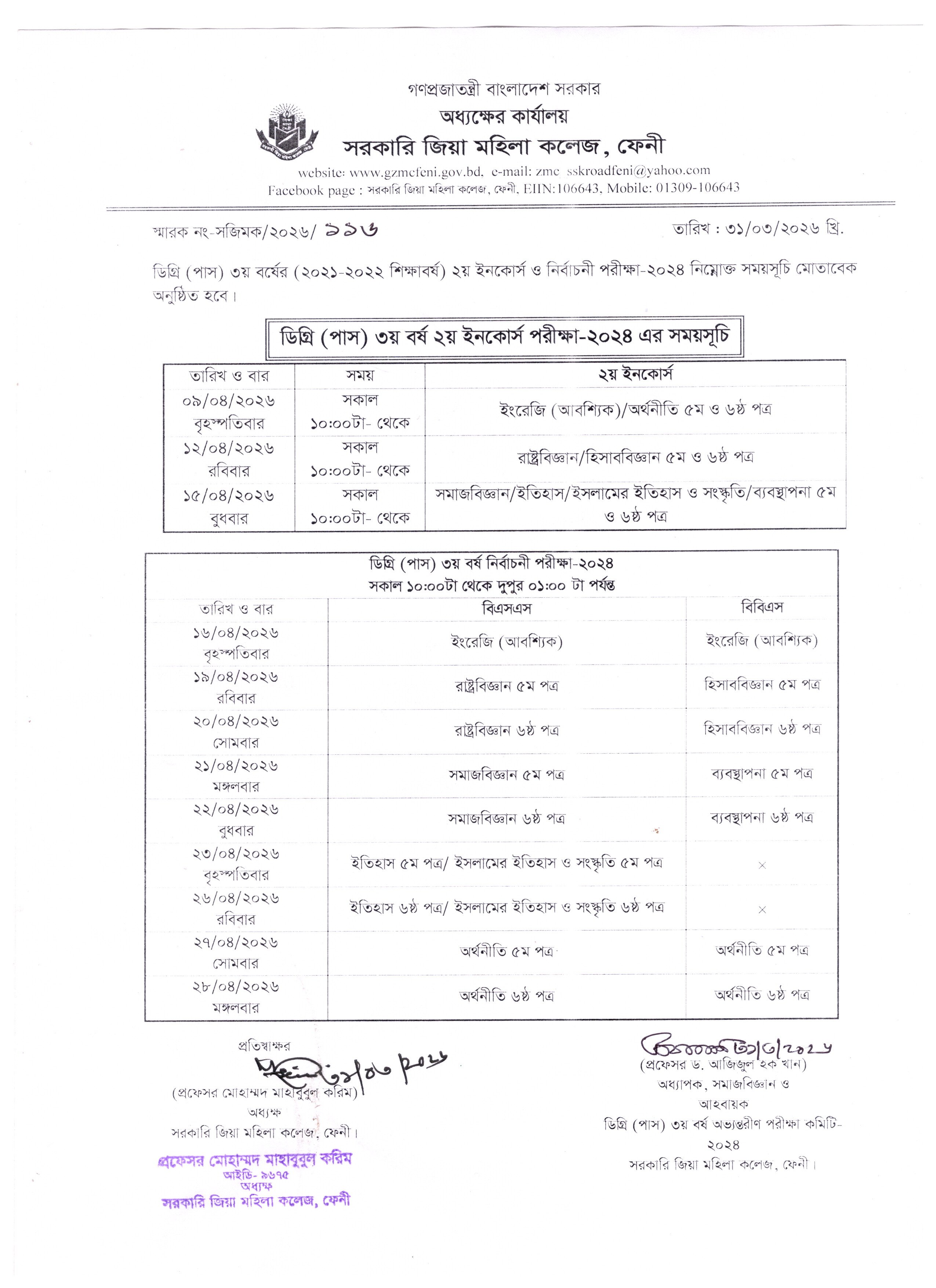 - ২০২১-২০২২ শিক্ষাবর্ষের ডিগ্রি (পাস) ৩য় বর্ষ ২য় ইনকোর্স ও নির্বাচনী পরীক্ষার সময়সূচি।