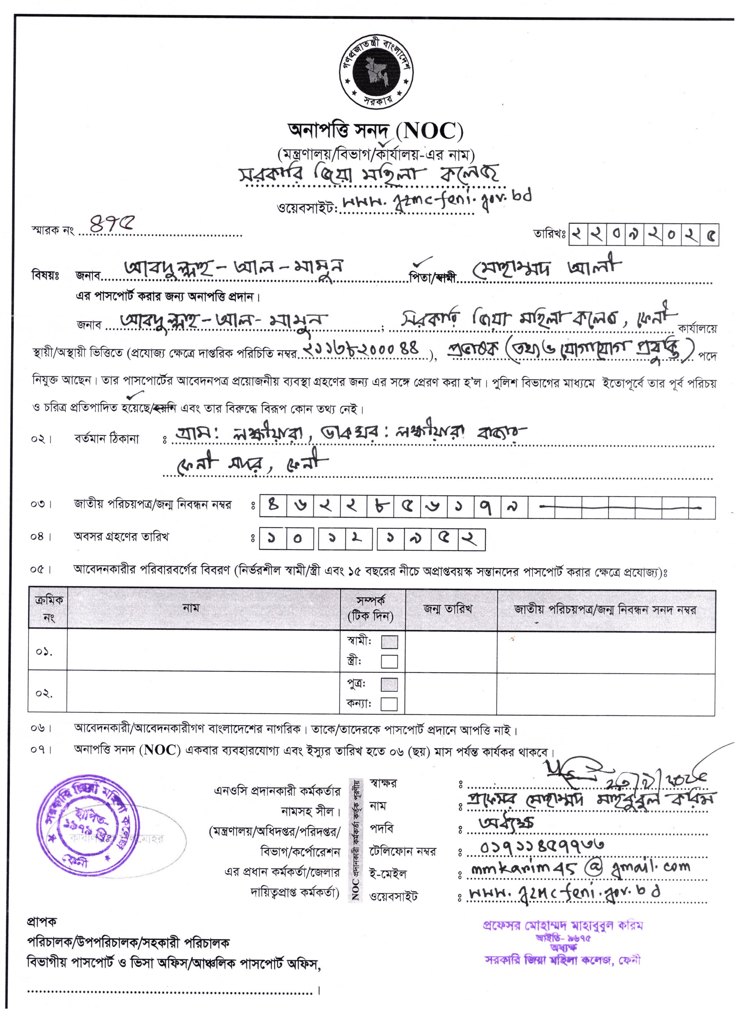 - জনাব আবদুল্লাহ-আল-মামুন, প্রভাষক, তথ্য ও যোগাযোগ প্রযুক্তি এর আন্তর্জাতিক পাসপোর্ট করার জন্য অনাপত্তিপত্র।
