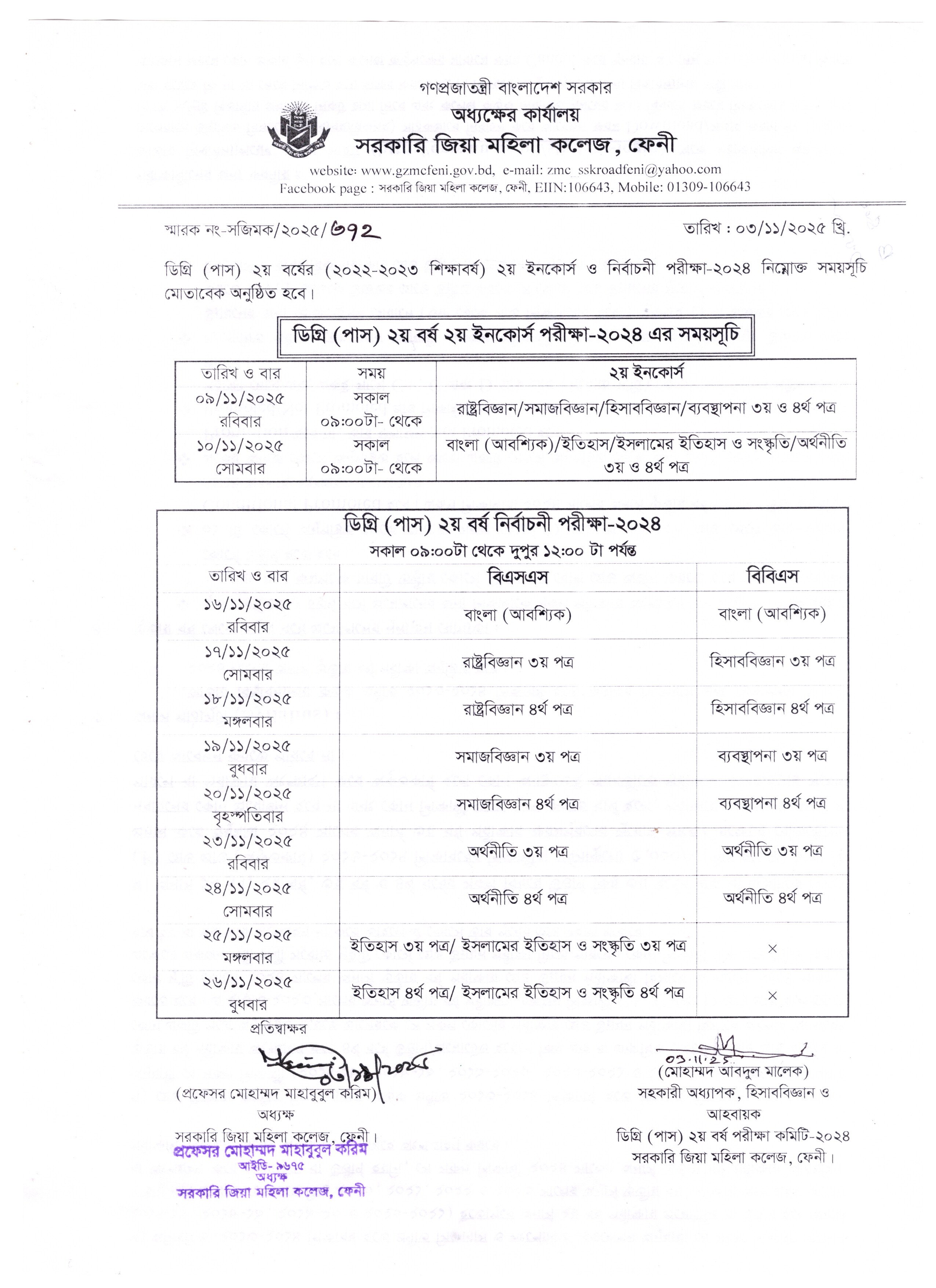 - ২০২২-২০২৩ শিক্ষাবর্ষ ডিগ্রি (পাস) ২য় বর্ষ ২য় ইনকোর্স ও নির্বাচনী পরীক্ষা-২০২৪ এর সময়সূচি।